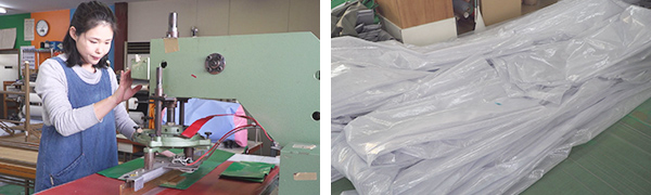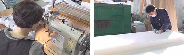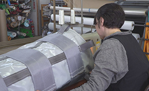「基本的にテントは、外で使うケースが多いので、防水が大切。乾かせば、すぐ元通りになるとか・・・・。これが、防水加工。それから燃えないことも大切。これは防炎加工で、生地メーカーでそういうものを作っています。それを問屋さんから仕入れて、当社で裁断をしてミシンで加工しています」