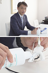 フッ素イオン導入機は昭和31年の発売以来、改良を重ねながらのロングセラー。さらにナルコームでは新商品の開発にも取り組み、現在、イチオシの製品は、歯周ポケットを測定する機械です。歯周ポケットに針を差込み、フットスイッチを踏むだけで、数値がパソコンに取り込まれます。猪俣社長は「今までにない、新しい医療機器なので、まずは認知して頂くところからスタートしました」