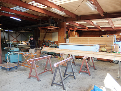 工場で作業をしているのは、長島命さん。「お客様の要望に応じて手作業で製品を作り、納品・取り付けまでを一貫して大工さんや私たち職人が行っています。お客様にも大切に使っていただけるよう心を込めて製材しています。」