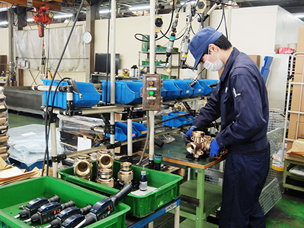 日邦バルブは明治16年創業。製糸用カランの製造販売から始まりました。大正中期、上水道の敷設を機に水道用分水栓や止水栓などの生産に携わるようになります。以来オリジナル商品を数多く開発し、日本の高品質な水道事業の発展に貢献してきました。主要製品は「耐震型サドル付き分水栓」と「応急給水機能付きメータバイパスユニット」です。