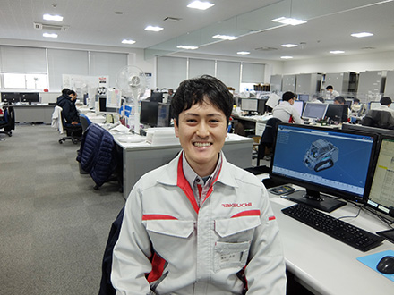 ミニショベルなどの小型建設機械を製造・販売している竹内製作所(坂城町)。開発設計一課の清水北登さんはキャビンと呼ばれる運転室の設計をしています。「シートや操作レバーなどの配置を考えるという、オペレーターからの評価に直結する仕事をしています。振動が伝わらないようなシートを設計するなど、操作するためのより最適なポジションを考え、設計します。」