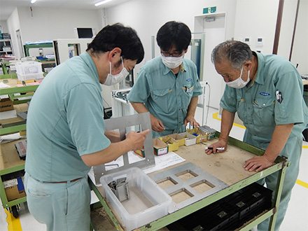購買グループの中山清志さんは部品の加工工程を担当しています。組立予定に合わせて部品を加工し、表面処理をして組立部署に渡します。「苦労した装置が出荷されていくのを見ると達成感があります。またリピートで注文が入ると、お客様に評価されていることが感じられて嬉しいです。」
