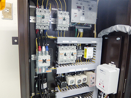 相生電子では医療機器のほか制御盤(機械や設備を自動制御する装置)も作っています。制御部では消雪ポンプの制御盤や計装盤、テレメーター盤などの設計製造・改造や電気工事などを一貫して行っています。