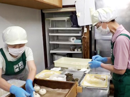 善光寺の門前にある「門前農館 さんやそう」には、地元の農産物を活かした手づくりの味が並びます。 さんやそうのおやきは、毎日スタッフがひとつひとつ手で包み、蒸し上げます。 皮も具材もすべて手づくり。季節の野菜や自家製みそを使っています!